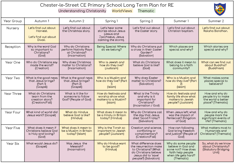 Our scheme of work is in accordance with the Durham Agreed Syllabus alongside the programme, ‘Understanding Christianity,’ which progressively builds their understanding of significant theological concepts within Christianity with their own self-understanding and understanding of the world as part of their wider religious literacy.
